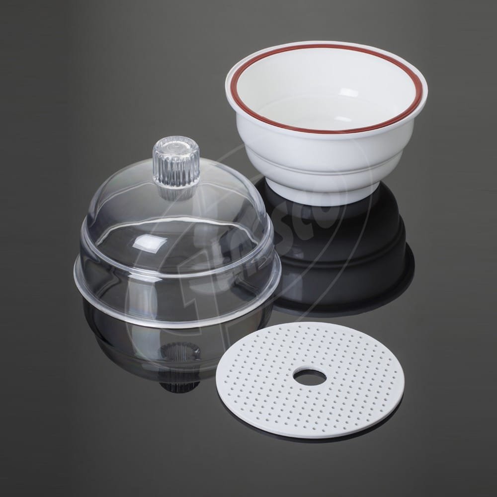 - Both Vacuum & Plain Desiccators are provided with a thick perforated Polypropylene disc with a big hole in the center for easy lifting