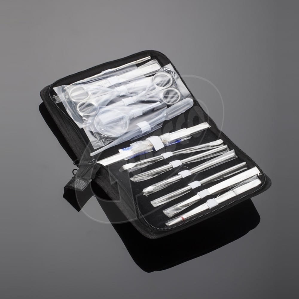 | 536.303.01 | made of Stainless Steel. Instruments are Dressing Scissor.Cuticle Scissor. Dressing Forceps. Dissecting Forceps.Flapper. Seeker. Arrow Needle. Needle. Blow Pipe. B.P. Handle with Scalpel Blade. Dropper. Chain Hook. Scalpels. Magnifier Lense. | Zip |